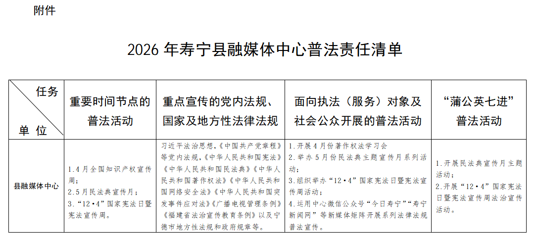 为严格落实国家机关“谁执法谁普法”普法工作责任制,进一步提升普法工作质效,确保寿宁县融媒体中心法治宣传教育工作高效开展,现结合工作实际,制定《2026年度寿宁县融媒体中心普法责任清单》,并将相关工作公布如下:
